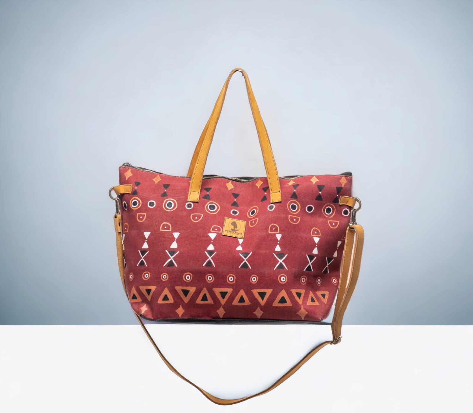 Eye-catching and fun, this bag is handpainted with a unique blend of colors to create African inspired patterns that are chic and bohemian.